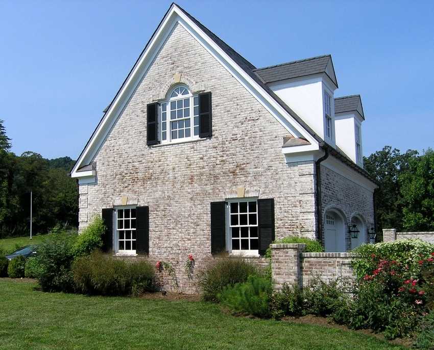 Часто встречающийся вариант оформления фронтона при строительстве домов из кирпича. Чтобы снизить количество зазоров между скатами и стенками фронтона, края строительного материала могут быть стесаны. Чтобы фронтон был прочнее, во время кладки используется арматурная сетка. Для удобства работы посередине торца устанавливается деревянная рейка высотой до конька кровли. От нее протягиваются тонкие шнуры так, чтобы сформировался равнобедренный треугольник.
