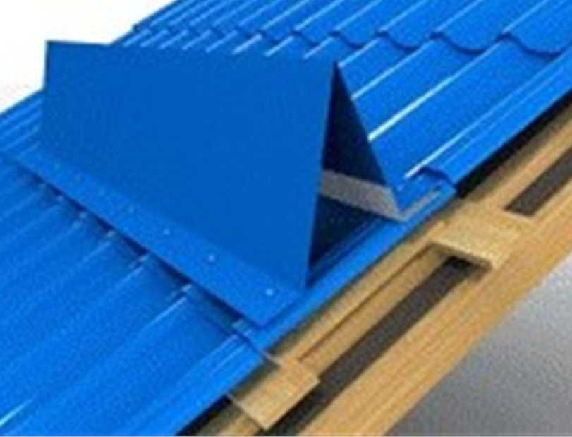 Далее производится монтаж торцевых и коньковых планок. Монтаж ветровой планки производится со стороны навесной части к коньку. Недостающую длину наращивают путем соединения планок внахлест, а лишнюю — обрезают. Таким образом, одна из волн листа накрывается планкой. Планка прикрепляется саморезами и к доске торца и к листам профнастила. При малой высоте волны листов между кровельным материалом и элементами конька укладывается уплотнитель.
