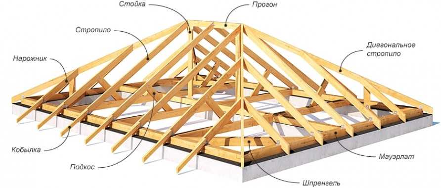 Схема устройства стропильной системы четырехскатной вальмовой крыши