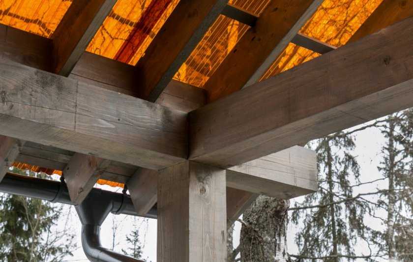 Когда выяснен вариант крыши, которой будет оснащена постройка, можно заняться подбором материала. Традиционно рассматриваемая конструкция с одним скатом представляет собой набор деревянных балок, соединённых между собой, покрытых кровельным материалом, аналогичным тому, что лежит на генеральном здании. Однако, если эта цель недостижима, то перекрытие подбирается в зависимости от финансовых ресурсов и целей, в которых будет эксплуатироваться веранда. Для лёгкой конструкции можно взять поликарбонат, для более тяжёлой — из металла (профнастил), цементно-асбестовых волокон (шифер) или подобные им.