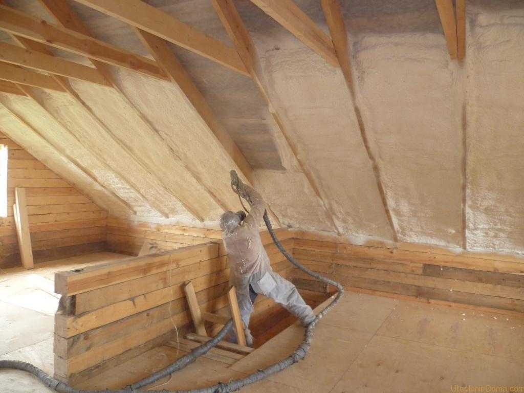 Единственный момент, который надо принять во внимание, это нанесение полиуретана на плоскость. Если обрешетка мансарды разряженная, то под нее надо уложить слой гидроизоляции, если сплошная, то подкладывать ничего не надо