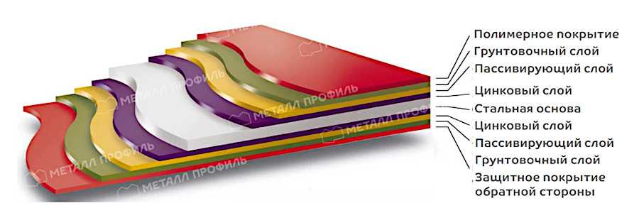 Полимерная защита металлочерепицы состоит из нескольких слоёв, каждый из которых повышает устойчивость к повреждениям и адгезию.