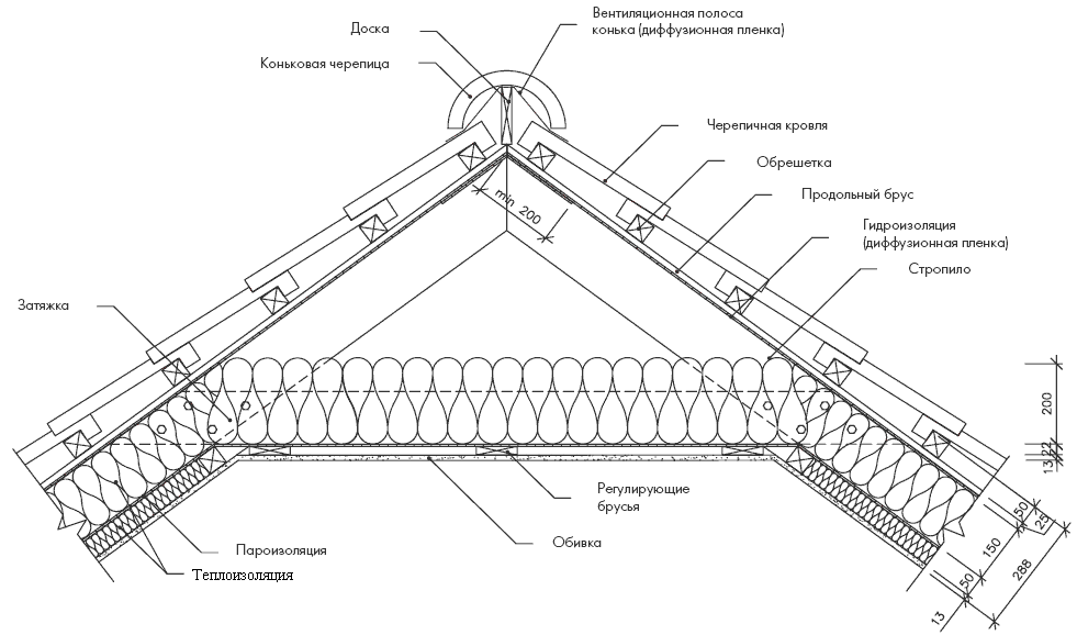 Окончание устройства голландской крыши, как и любой другой, включает в себя укладку обрешетки, пароизоляционного материала, а также утеплителя, гидроизоляционной пленки и непосредственно самой кровли. Необходимо свободное пространство под коньком для циркуляции воздуха и вентиляции.