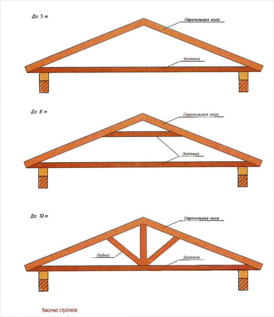 Висячие стропила монтируют при пролетах дома 6-14 м. Опираясь только на наружные стены, несущие балки воспринимают значительные распирающие усилия. Чтобы их распределить, в конструкцию вводят дополнительные горизонтальные и вертикальные элементы — ригели, затяжки, бабки (стойки, опирающиеся на затяжку).