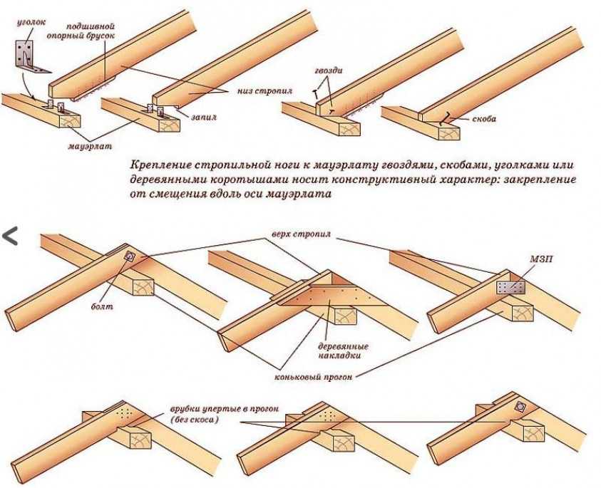 Систему усиливают прогонами, подкосами и стойками. К тому же это помогает уменьшить сечение стропил и прогибы. Соединяют элементы металлическим крепежом — гвоздями, скобами, болтами, накладками, кольцами, зубчатыми дисками.
