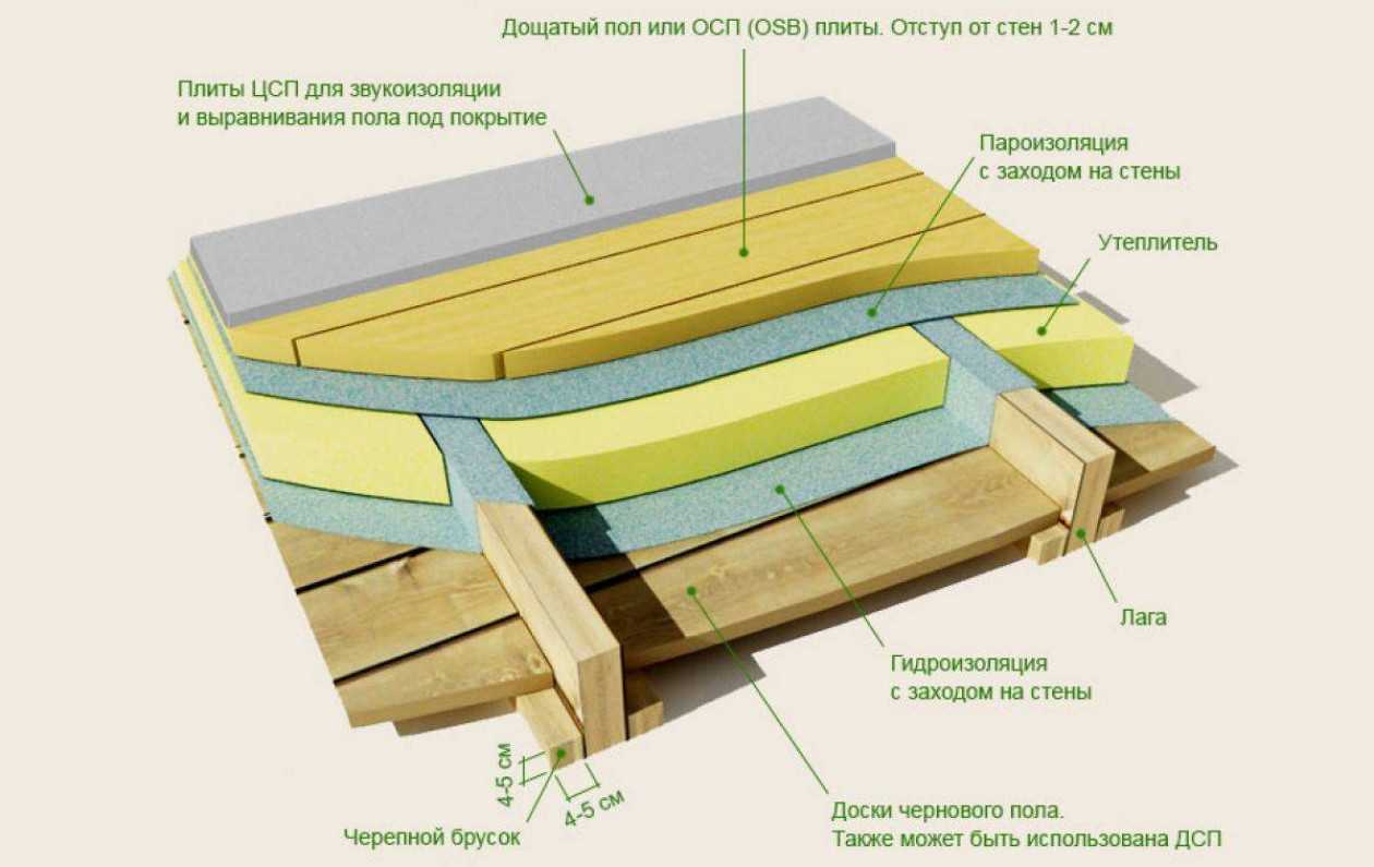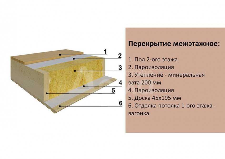 - межэтажные перекрытия снизу подбивают парозащитным покрытием, затем потолочной доской, фанерой или древесными плитами. После укладки тепло- и звукоизоляции, конструкцию накрывают паромембраной и настилают половые доски.